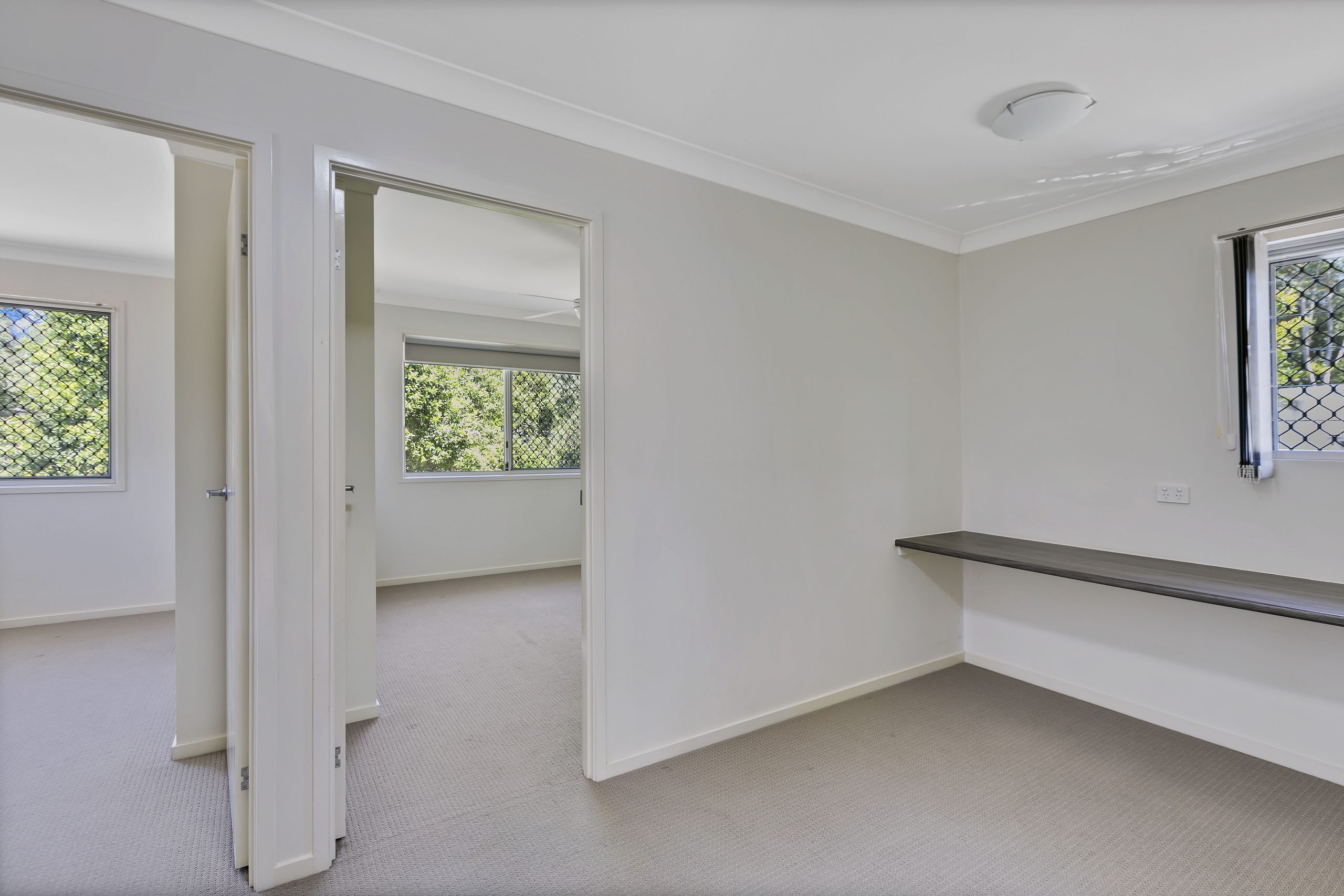 Tiled living areas downstairs and carpets in the bedrooms and the study nook upstairs.