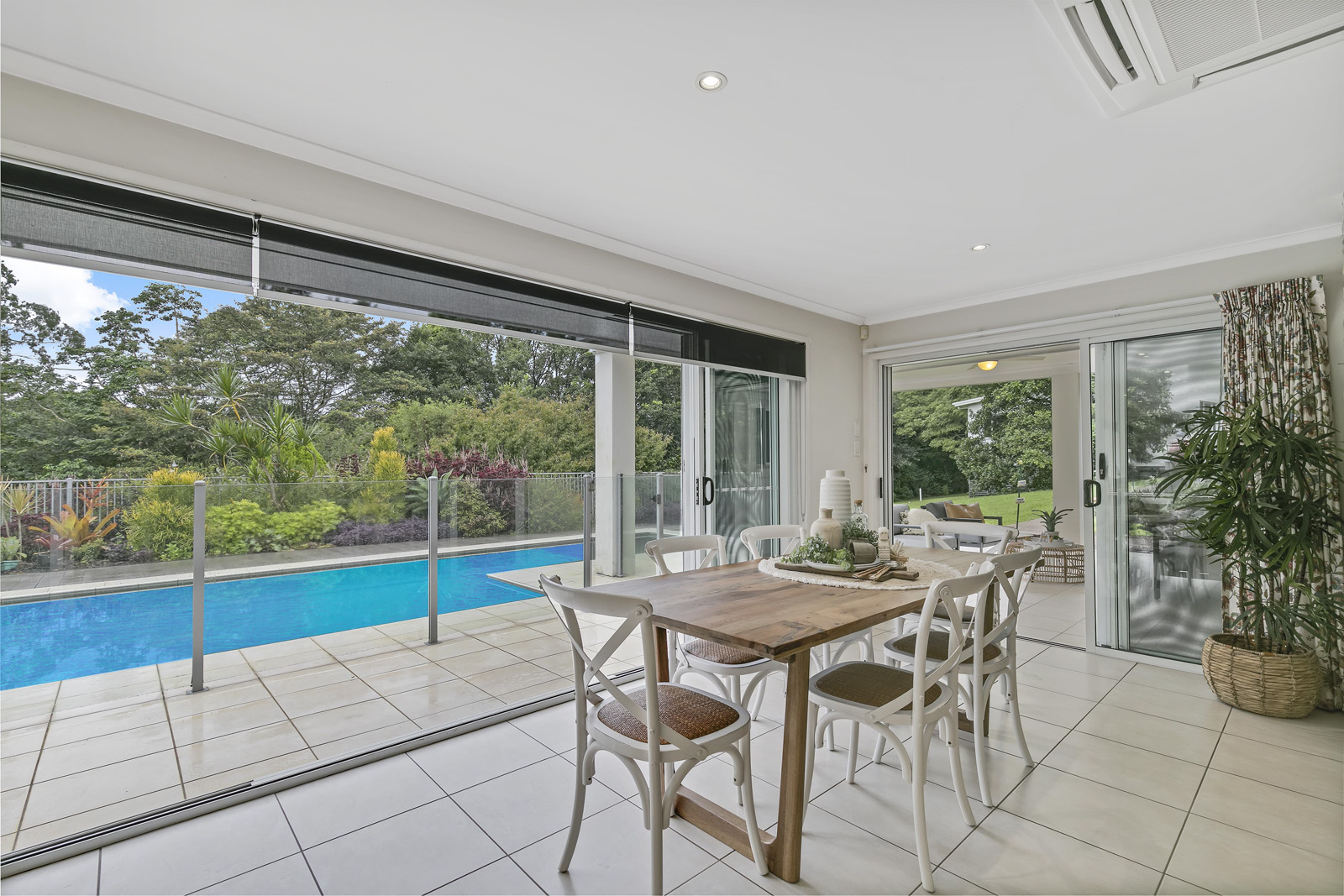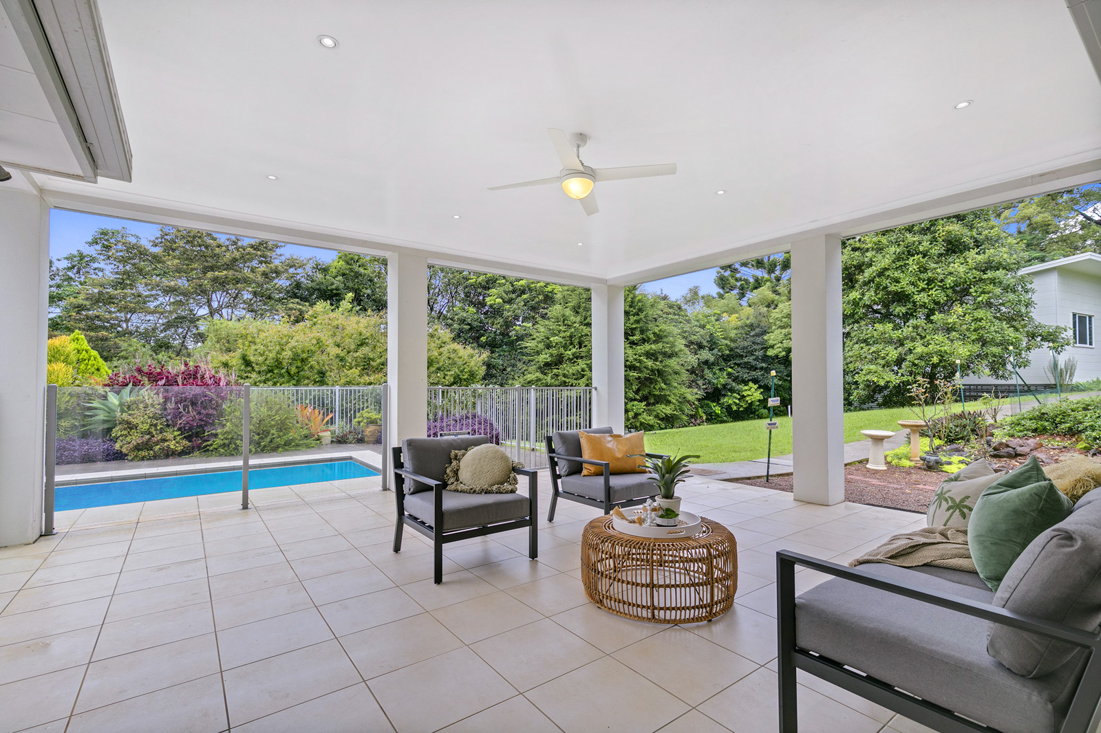 Open plan living has easy access out to the covered outdoor area with overlooks the pool.
