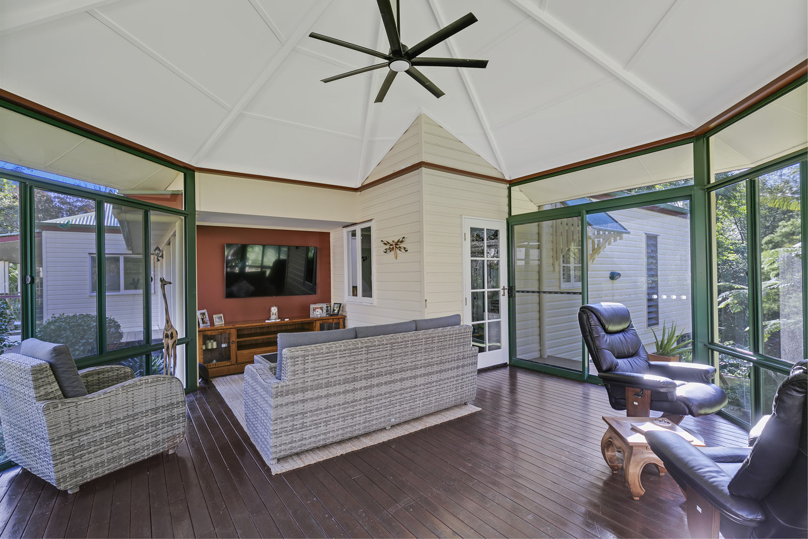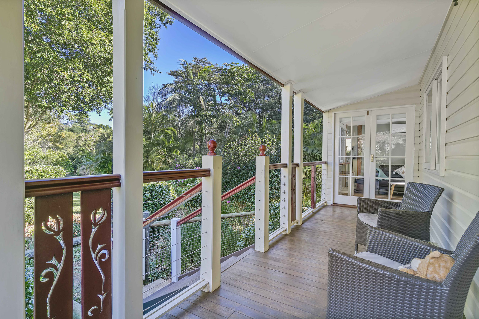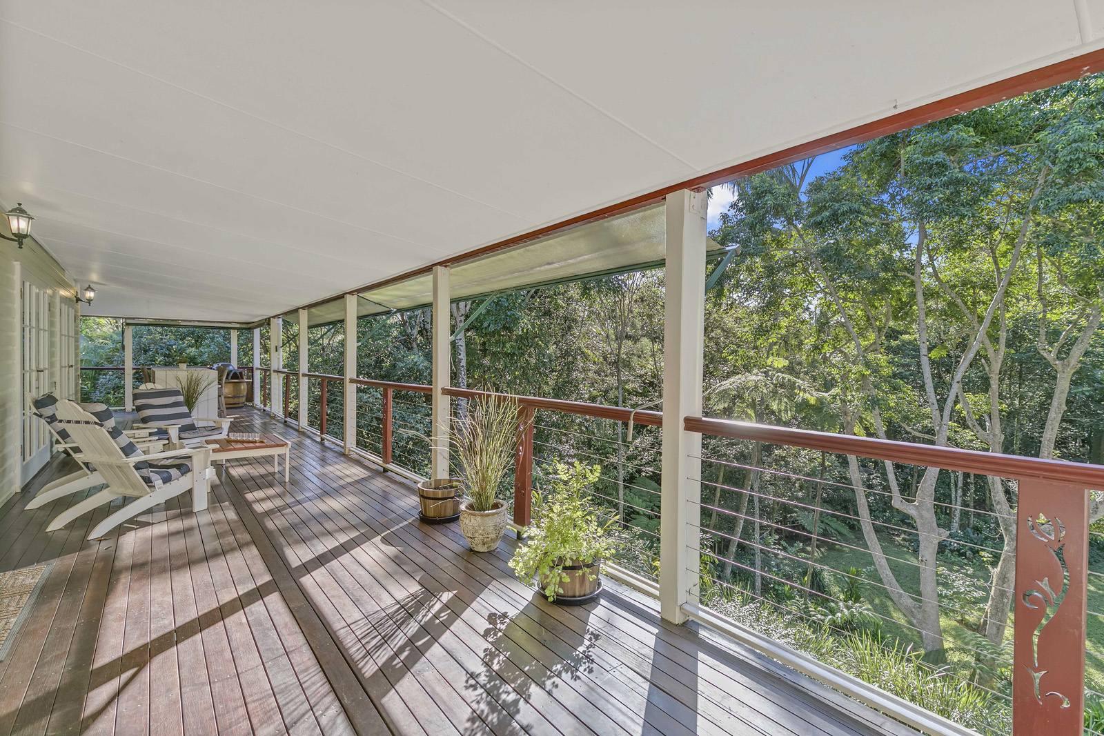 Expansive north facing verandah overlook the tropical rainforest area with views of the babbling brook.