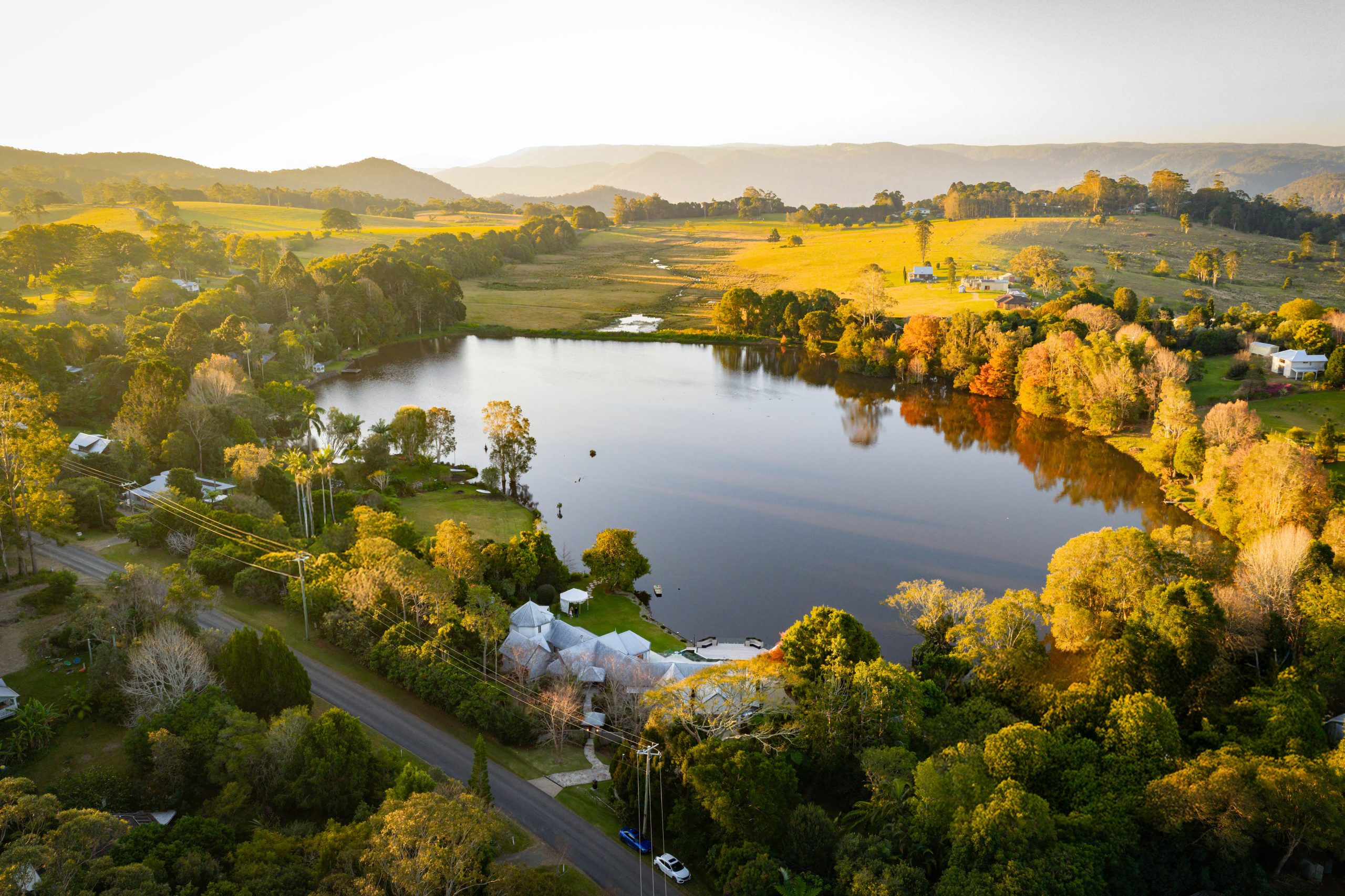 Set high in the rolling green hills just minutes from Maleny township, Magnolia Lakehouse Maleny is a rare lakeside estate of architectural provenance, scale and natural beauty. Originally designed by John Oliver as one of his signature rammed earth residences, the home has been extensively restored, extended and reimagined through a near seven-figure renovation completed in 2023. The result is an elegant turnkey estate offering approximately 650 sqm of combined floor and lifestyle area, excluding the pool and over-water deck, on circa 5,000 sqm of private grounds.