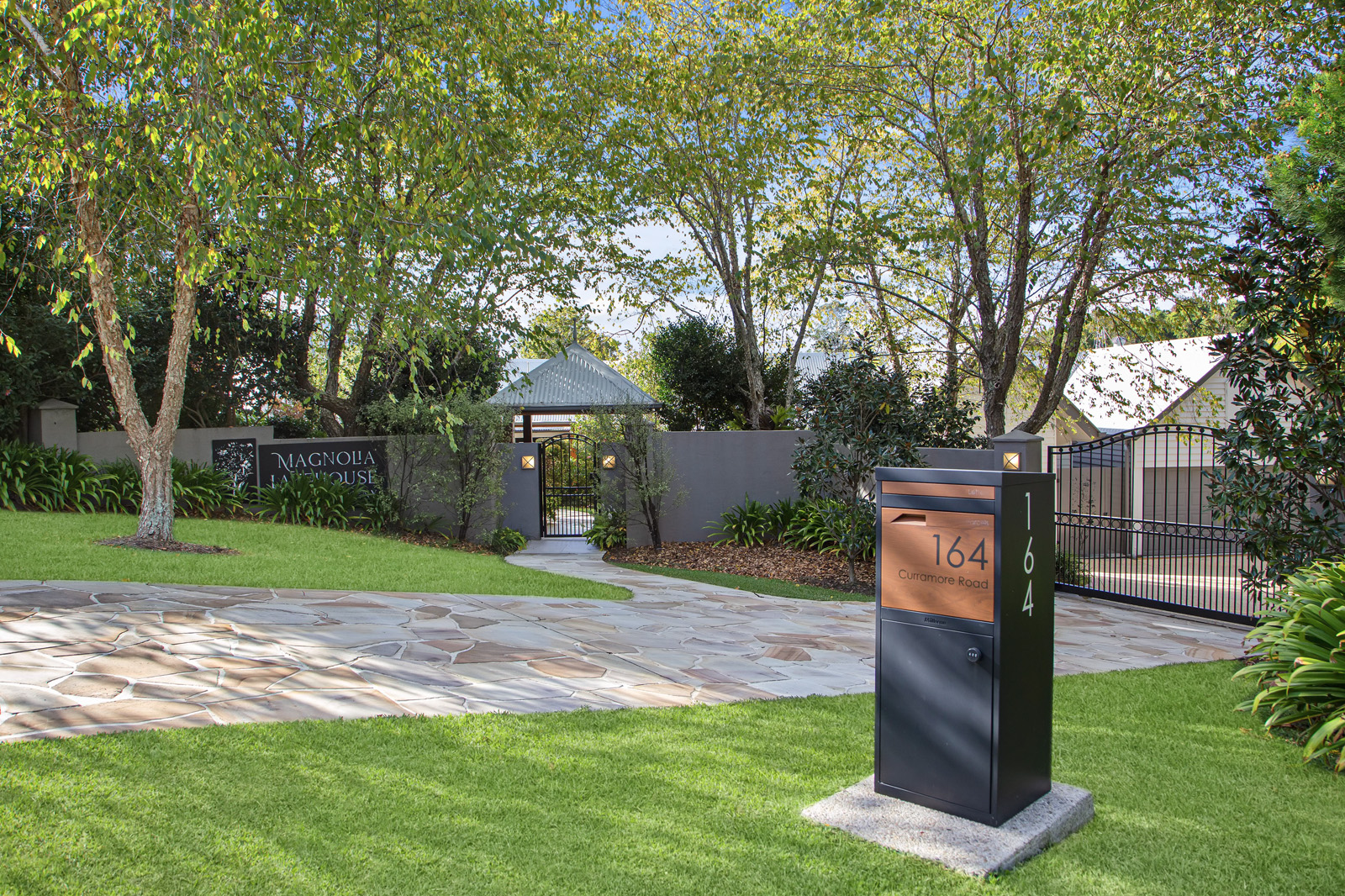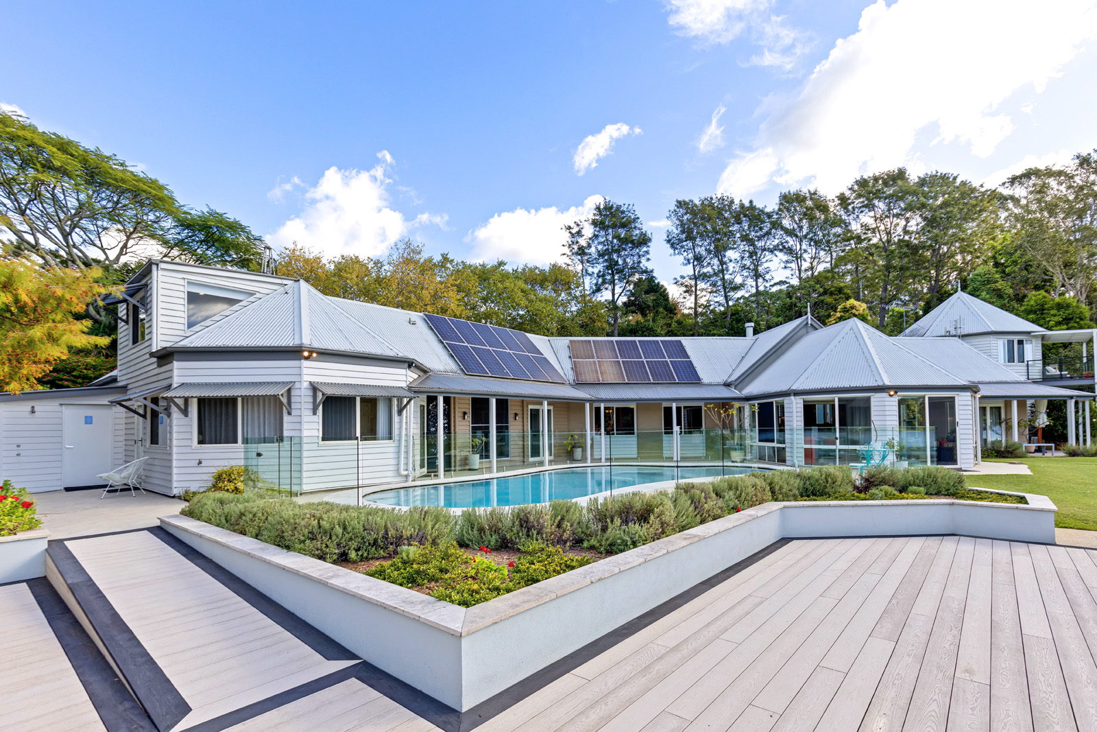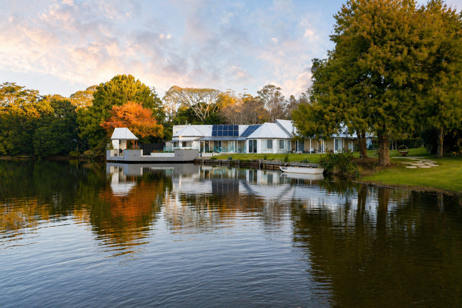 Beyond the deck and pool, the grounds unfold into lawns, established gardens, magnolias, camellias, seasonal planting and mature trees, leading to the lake itself, alive with turtles, water dragons, small fish and birdlife. The landscape offers both refined beauty and a sense of natural immersion.