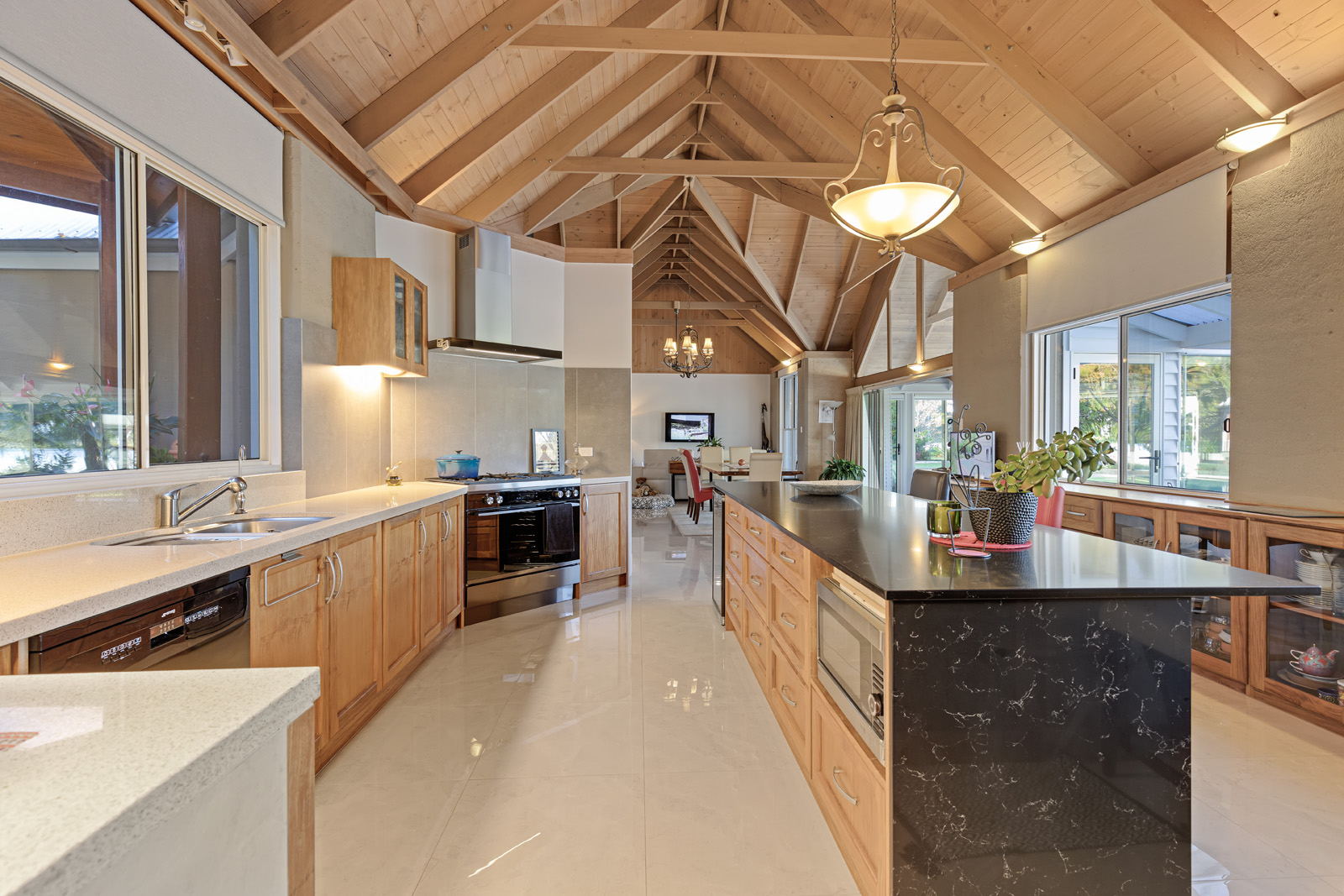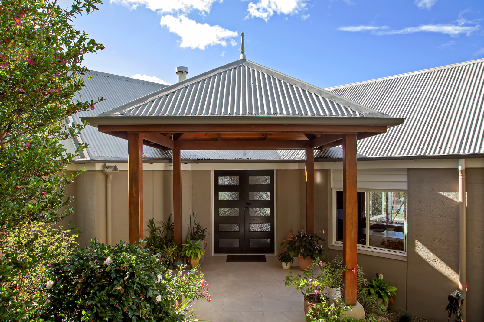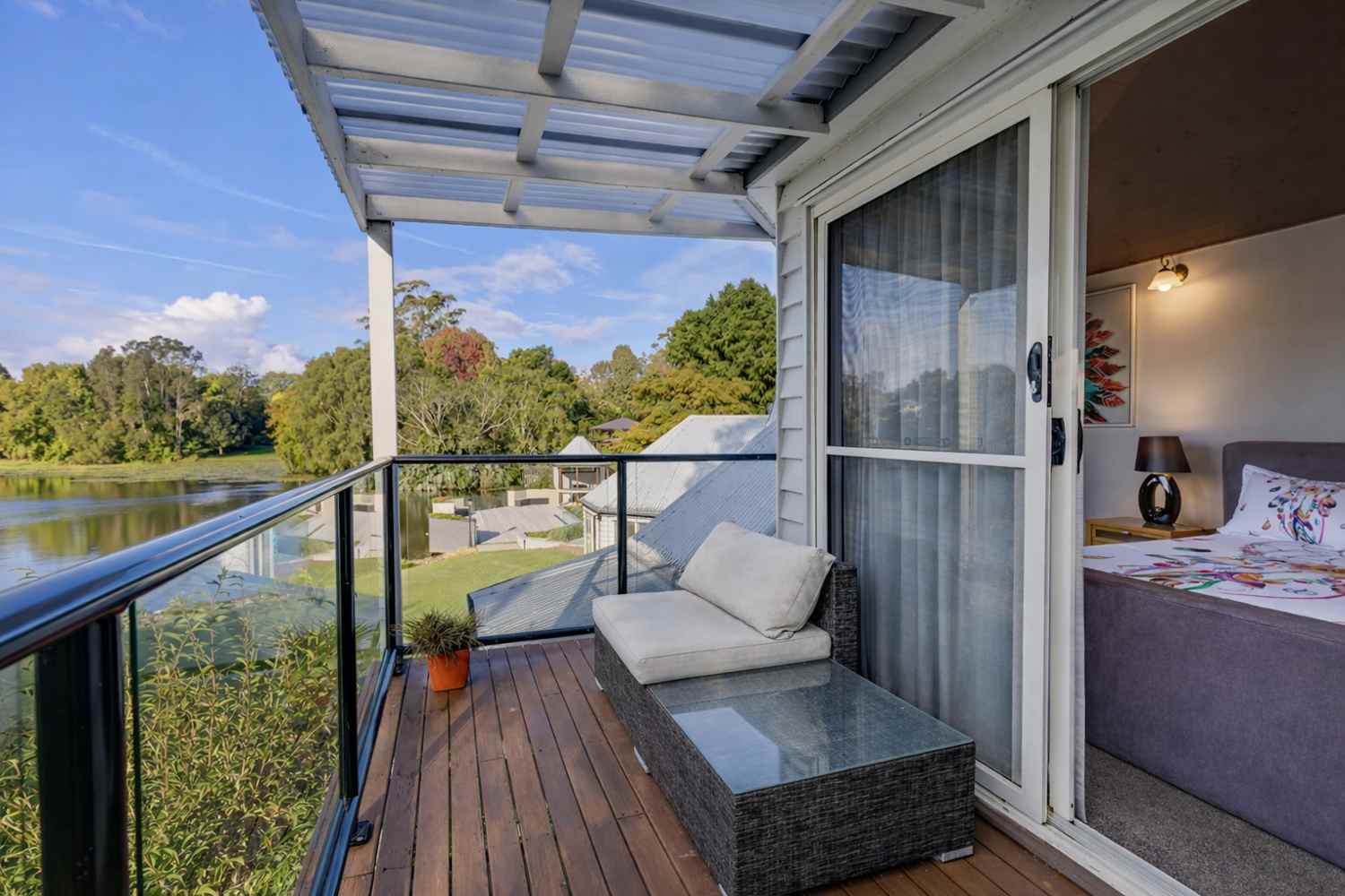 Beyond the deck and pool, the grounds unfold into lawns, established gardens, magnolias, camellias, seasonal planting and mature trees, leading to the lake itself, alive with turtles, water dragons, small fish and birdlife. The landscape offers both refined beauty and a sense of natural immersion.