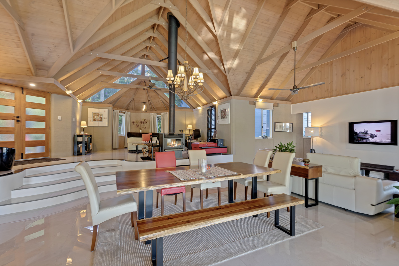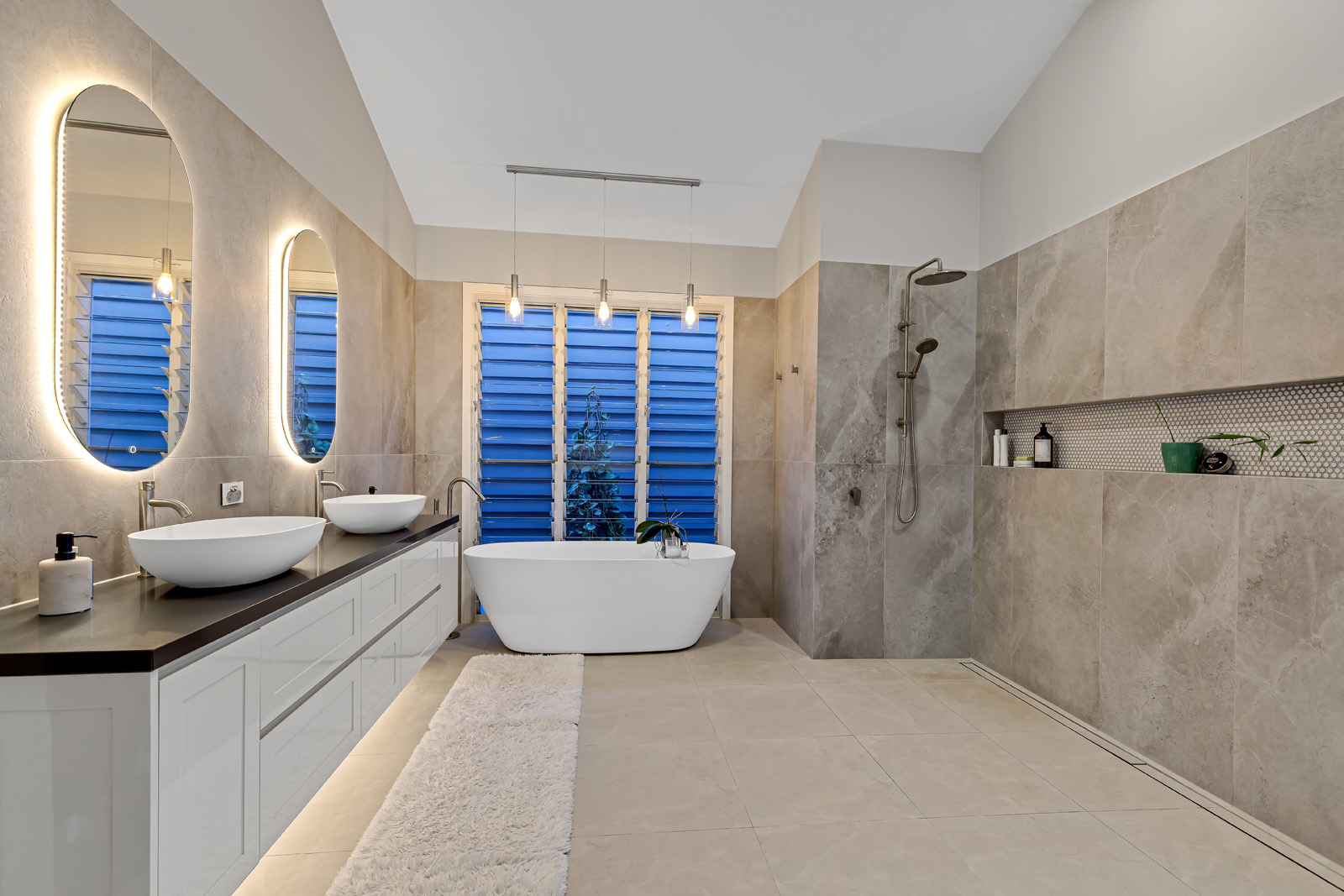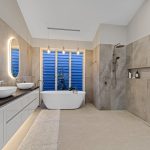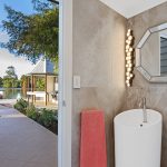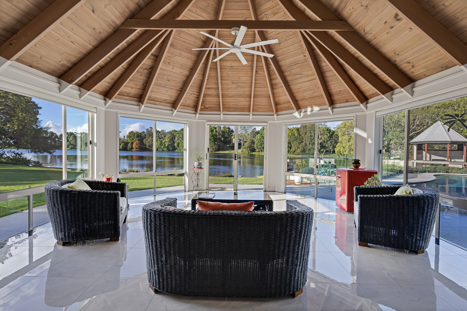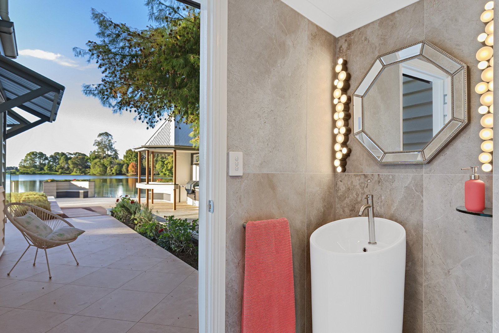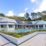 Outdoor living is exceptional. The 135 sqm cantilevered over-water deck has been engineered with steel beams and screw piers to minimise impact on the lake ecosystem and finished in imported UK Millboard. It features built-in seating, integrated garden beds, glass balustrading, a gazebo, bar and barbecue area with hot and cold water, plus a connected powder room and outdoor shower. Beside it sits the 55,000-litre saltwater pool with shallow lounging and deeper swimming zones.