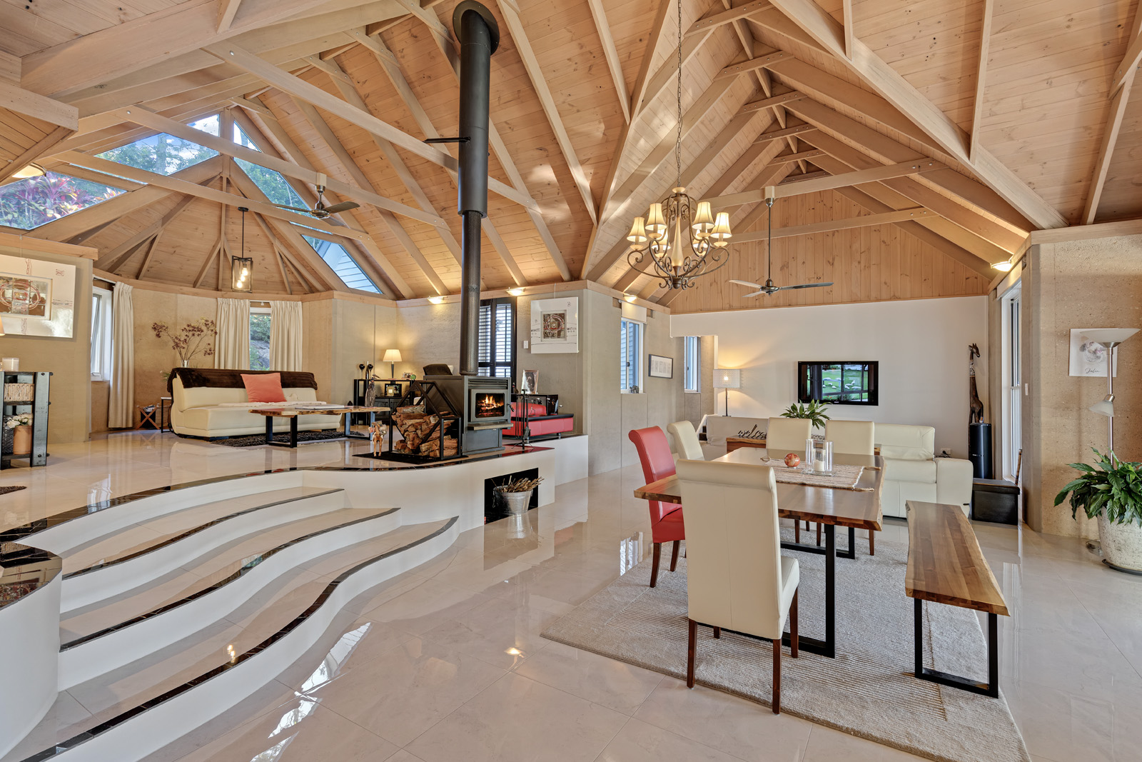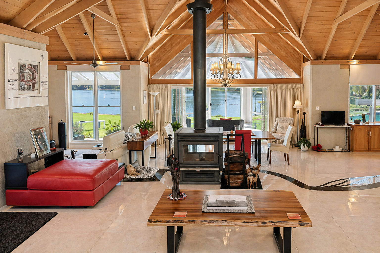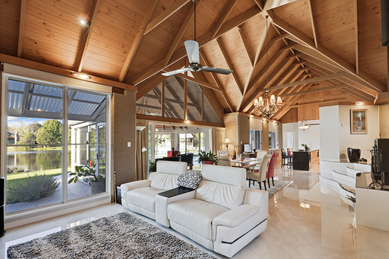 A defining feature is the estate’s substantial ownership of the spring-fed lake, including the prominent section directly in front of the residence. This creates a rare sense of privacy, calm and natural theatre, with water, gardens and sky forming a constant visual connection throughout the home.