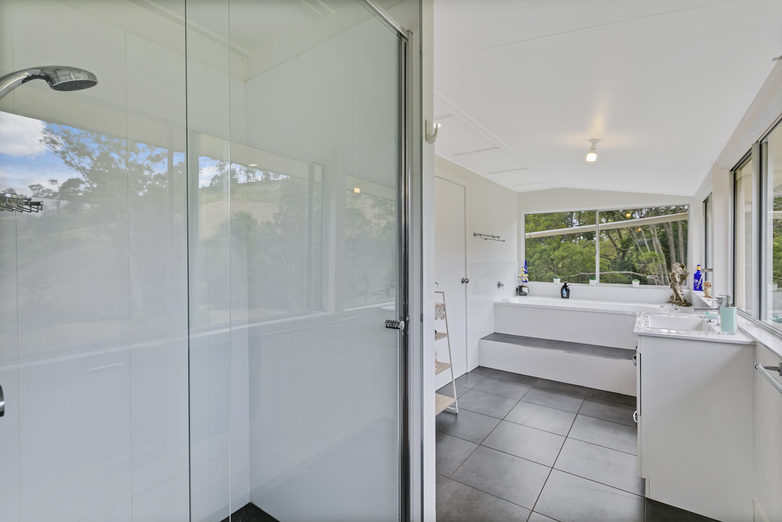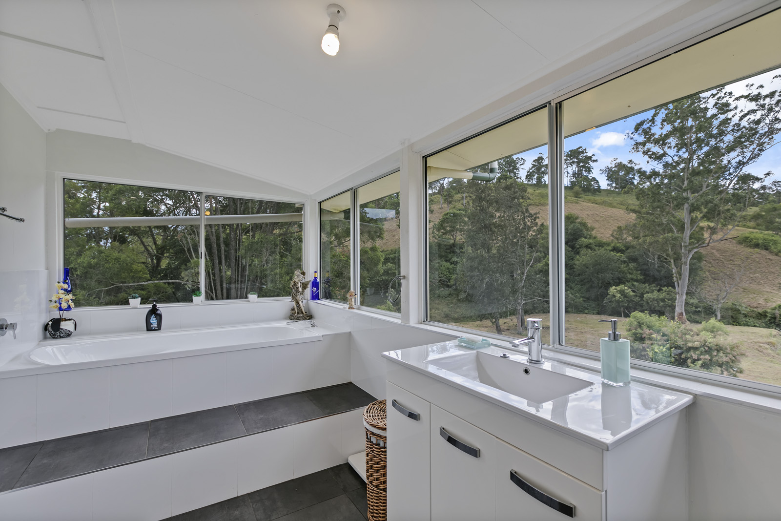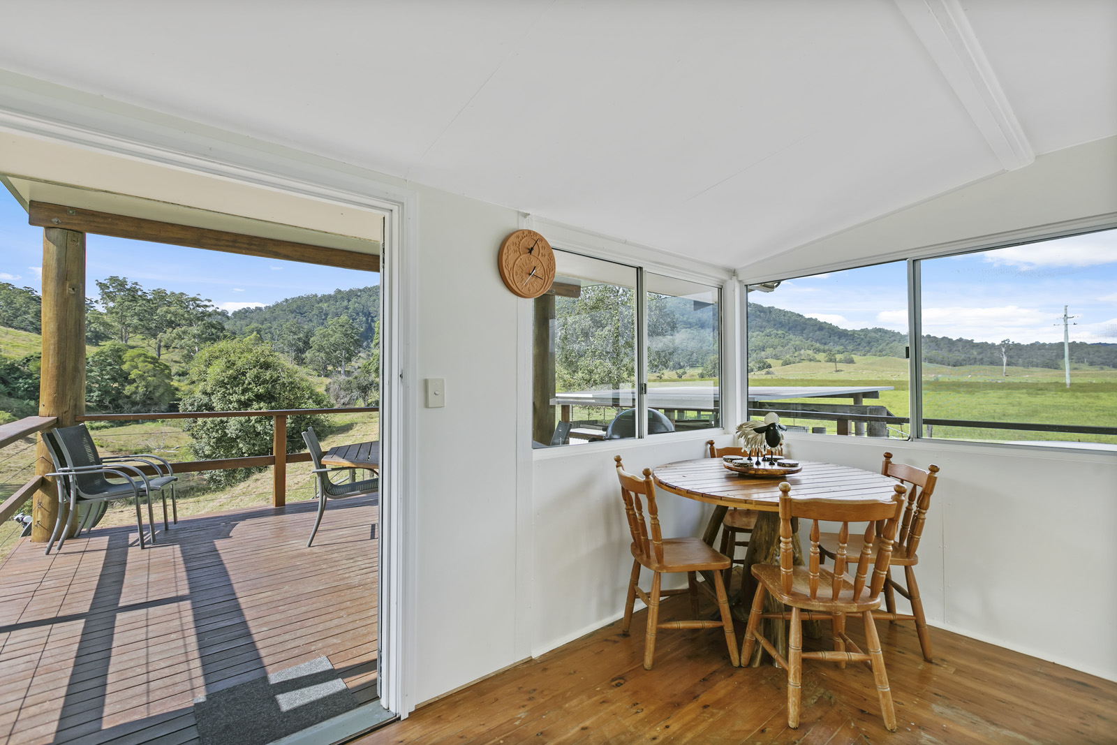 Living room opens onto an expansive undercover entertaining area overlooking the property’s permanent spring-fed creek