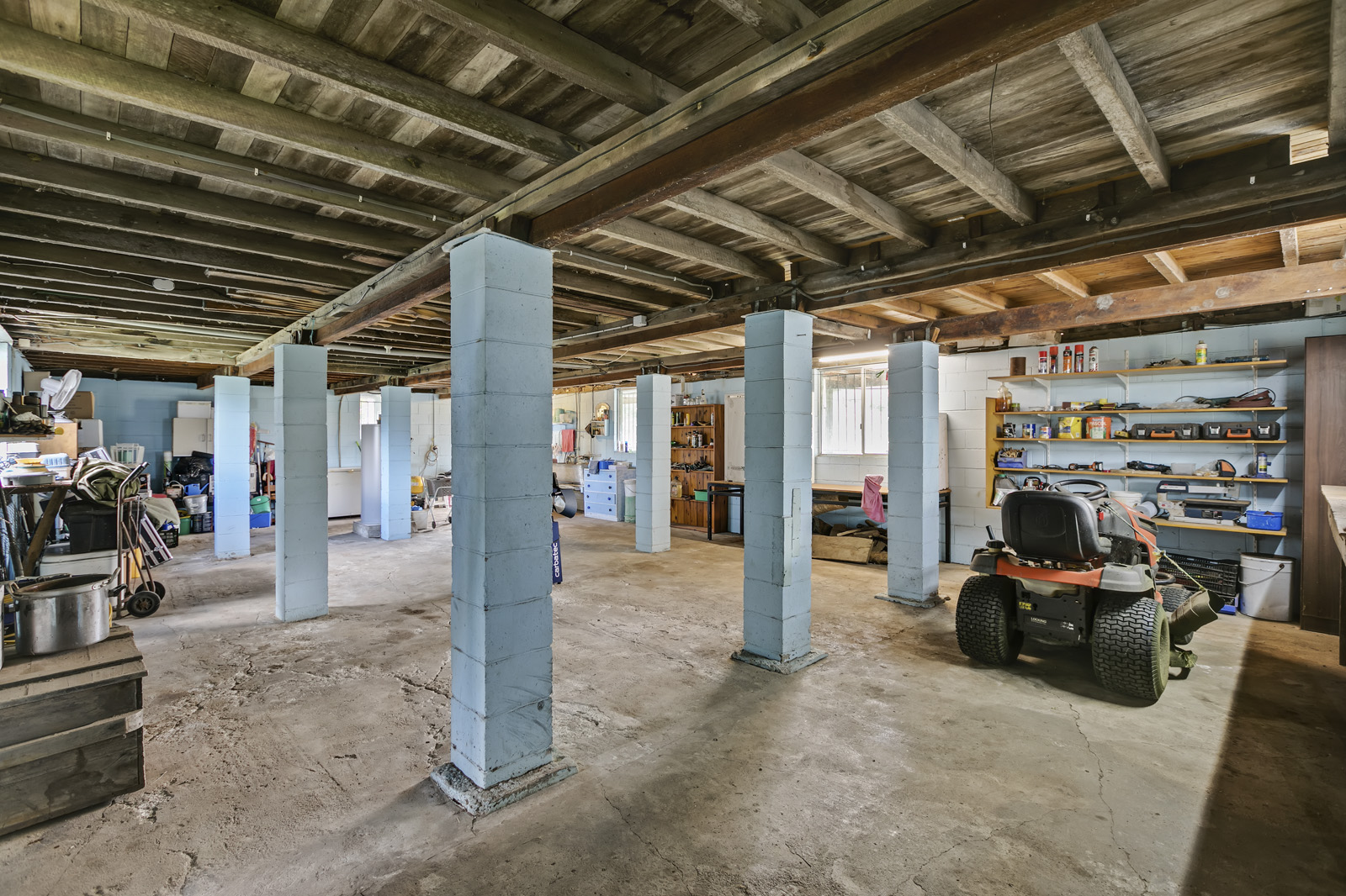 Loads of storage, laundry and work-space including benches and shelving, under the full area of the house on ground level