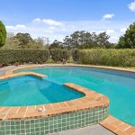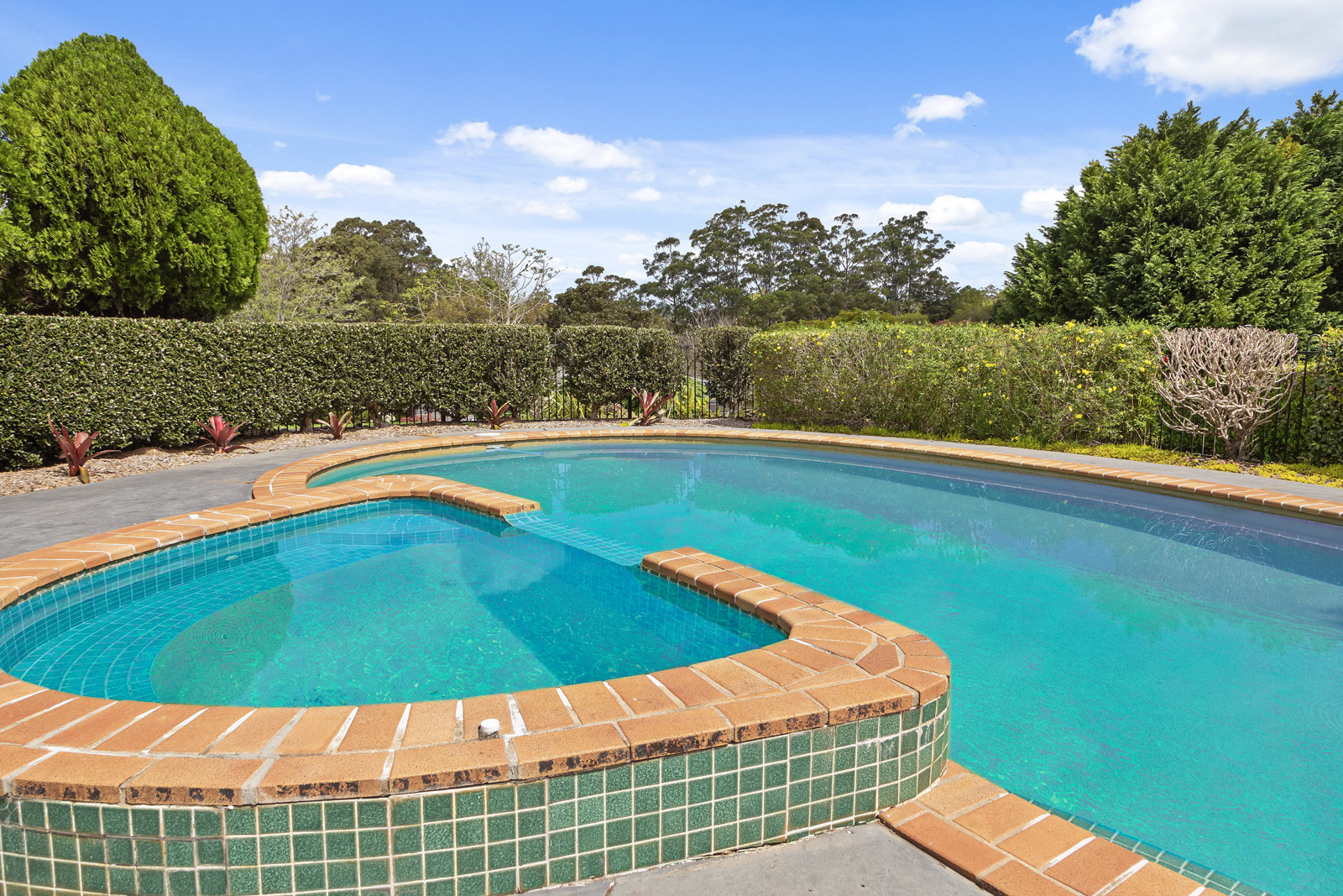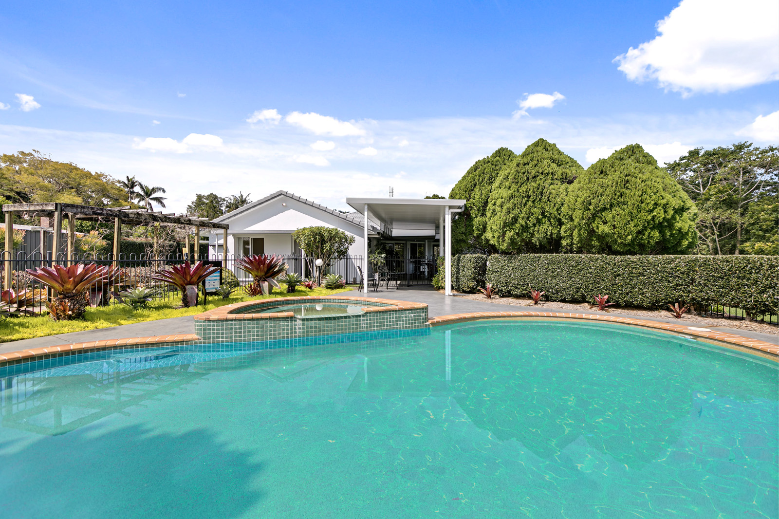 The sparkling inground saltwater pool plus spa pool has a lush tropical feel with leafy surrounds.